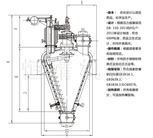 螺旋搅拌可把物料由底部提升到高点再自由散落的不断运动,导致物料不断的在夹套和螺旋带加热区运动。①增加了加热面积②使物料保持松散的工况下运动。
