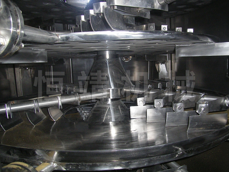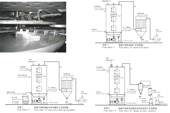 湿物料自加料器连续地加到干燥器上部层干燥盘上,带有耙叶的耙臂作回转运动使耙臂作回转运动使耙叶连续地翻抄物料。物料沿指数螺旋线流过干燥盘表面,在小干燥盘上的物料被移送到外缘,并在外缘落到下方的大干燥盘外缘,在大干盘上物料向里移动并从中间落料口落如下一层小干燥盘中。大小干燥盘上下交替排列,物料得以连续地流过整个干燥器。中空的干燥盘内通入加热介质,加热介质形式有饱和蒸汽、热水和导热油,加热介质由干燥盘的一端进入,从另一端导出。已干物料从后一层干燥盘落到壳体的底层,后被耙叶移送到出料口排出。湿份从物料中逸出,由设在顶盖上的排湿口排出,真空型盘式干燥器的湿气由设在顶盖上的真空泵口排出。从底层排出的干物料可直接包装。通过配加翅片加热器、溶剂回收冷凝器、袋式除尘器、干料返混机构、引风机等辅机,可提高其干燥的生产能力,干燥膏糊状和热敏性物 料,可方便地回收溶剂,并能进行热解和反应操作。